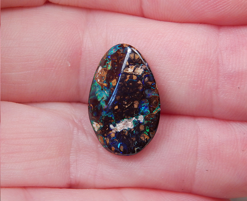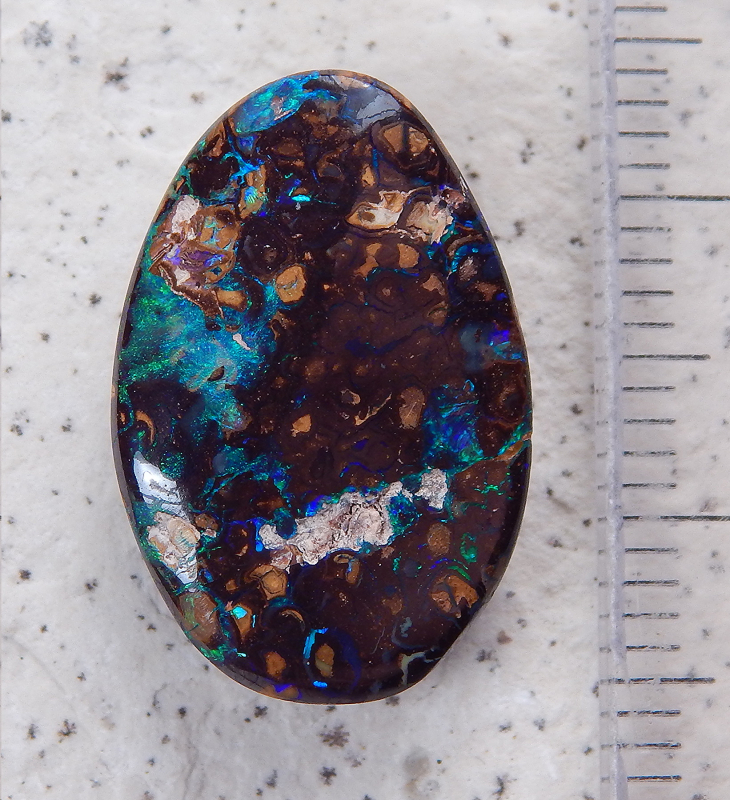 Koroit-Nut -Fundort: Koroit -Gewicht: 10,82 ct. -Größe: 19 x 12 x 5,3 mm -Farben: grün & blau -Bitte beachten Sie, dass Unebenheiten, Einschlüsse, Flecken oder Risse,Sprünge o.ä. natürlich sind und keinen Mangel darstellen.Video anklicken