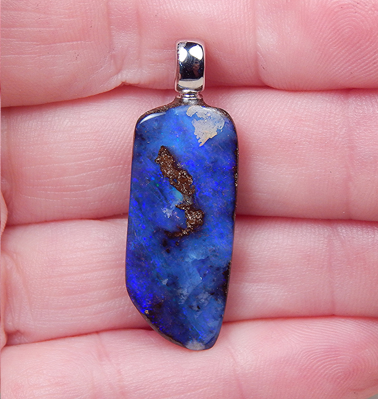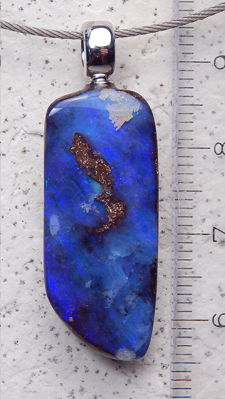 Boulderopal mit 925 SS Öse rhodiniert - Fundort: Quilpie - Opal: 30 x 13 x 5,7 mm - Anhänger: 39 x 13 x 5,7 mm - Ösenöffung: 4,5 x 3,3 mm - Gewicht: 5,39 Gramm - Farben: blau & violett - Bitte beachten Sie, dass Unebenheiten, Einschlüsse, Flecken oder Risse, Sprünge o.ä. natürlich sind und keinen Mangel darstellen. - Video anklicken