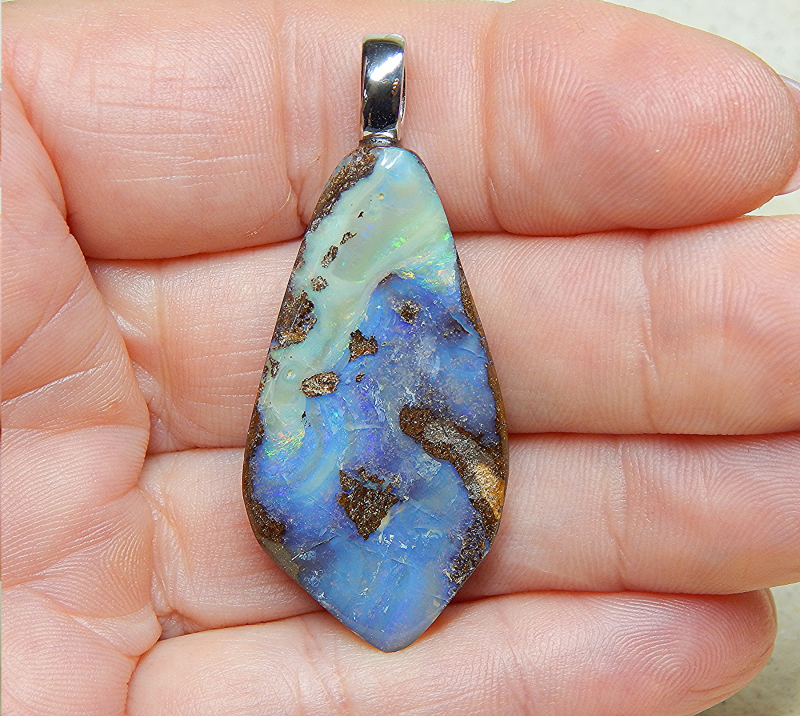 Boulderopal mit 925 SS Öse rhodiniert - Fundort: Quilpie - Opal: 42 x 21 x 6,3 mm - Anhänger: 51 x 21 x 6,3 mm - Ösenöffung: 6,6 x 4,8 mm - Gewicht: 9,79 Gramm - Farben: blau & grün - Bitte beachten Sie, dass Unebenheiten, Einschlüsse, Flecken oder Risse, Sprünge o.ä. natürlich sind und keinen Mangel darstellen. - Video anklicken