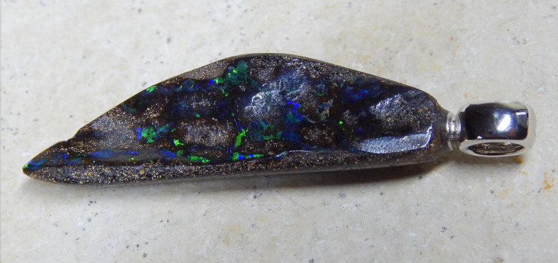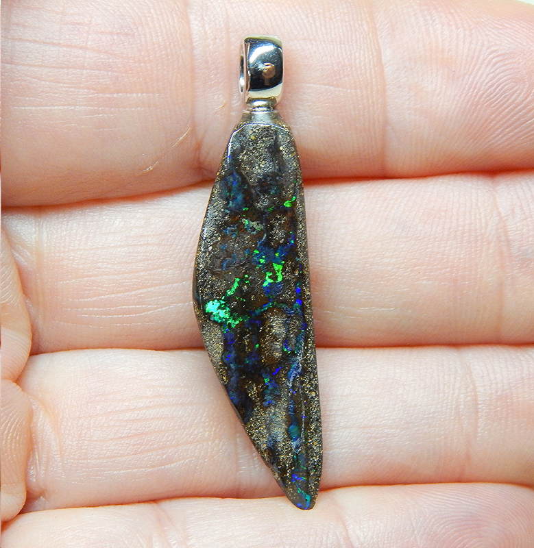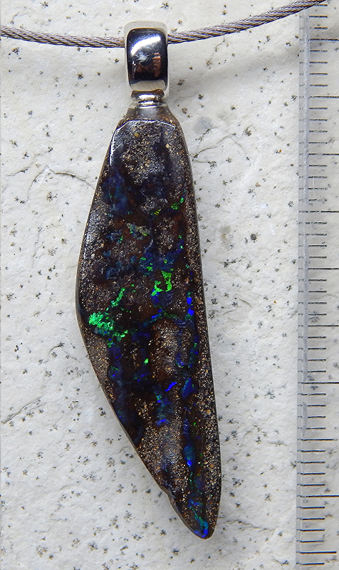 Boulderopal mit 925 SS Öse rhodiniert - Fundort: Quilpie - Opal: 36 x 11 x 5,5 mm - Anhänger: 44 x 11 x 5,5 mm - Ösenöffung: 4,5 x 3,3 mm - Gewicht: 3,89 Gramm - Farben: grün & blau - Bitte beachten Sie, dass Unebenheiten, Einschlüsse, Flecken oder Risse, Sprünge o.ä. natürlich sind und keinen Mangel darstellen. - Video anklicken