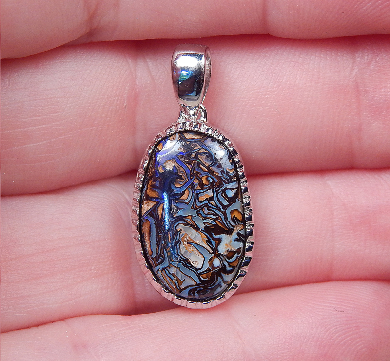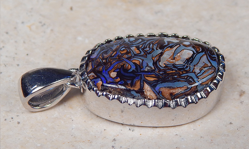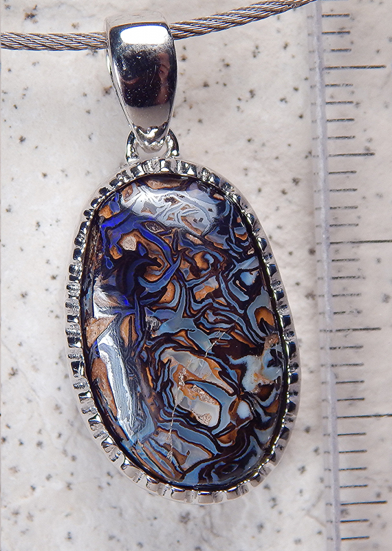 925 SS Designer-Anhänger mit Koroit-Nuss - 925 Sterling Silber rhodiniert - Fundort: Koroit - Opal: 18 x 11 mm / 12,37 ct. - Anhänger: 27 x 13 x 6,8 mm - Gewicht: 5,11 Gramm - Farben: violett - Bitte beachten Sie, dass Unebenheiten, Einschlüsse, Flecken oder Risse, Sprünge o.ä. natürlich sind und keinen Mangel darstellen. Video anklicken