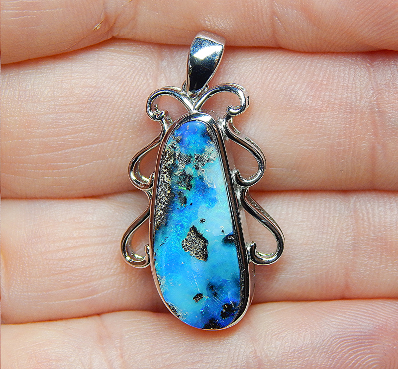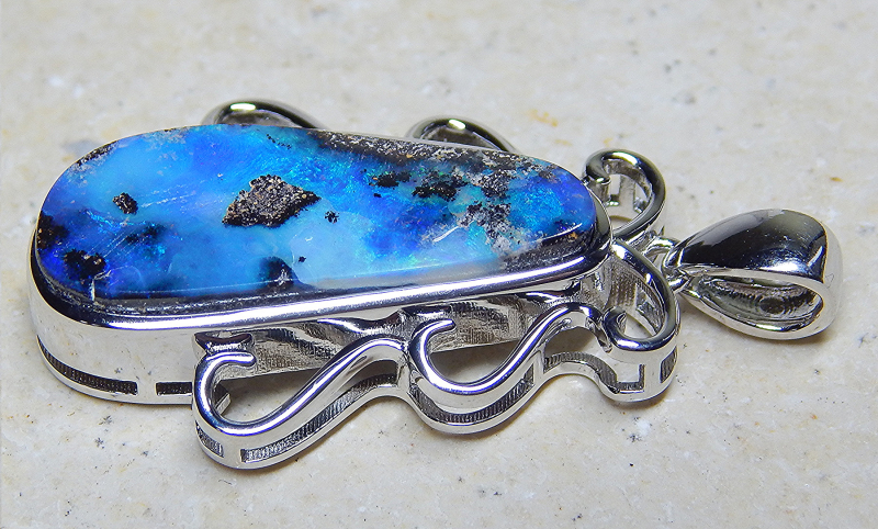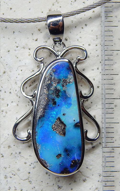 925 SS Designer-Anhänger mit Boulderopal - 925 Sterling Silber rhodiniert - Fundort: Quilpie - Opal: 23 x 9 mm / 8,53 ct. - Farben: blau - Anhänger: 33 x 18 mm - Gewicht: 5,29 Gramm - Bitte beachten Sie, dass Unebenheiten, Einschlüsse, Flecken oder Risse, Sprünge o.ä. natürlich sind und keinen Mangel darstellen. Video anklicken