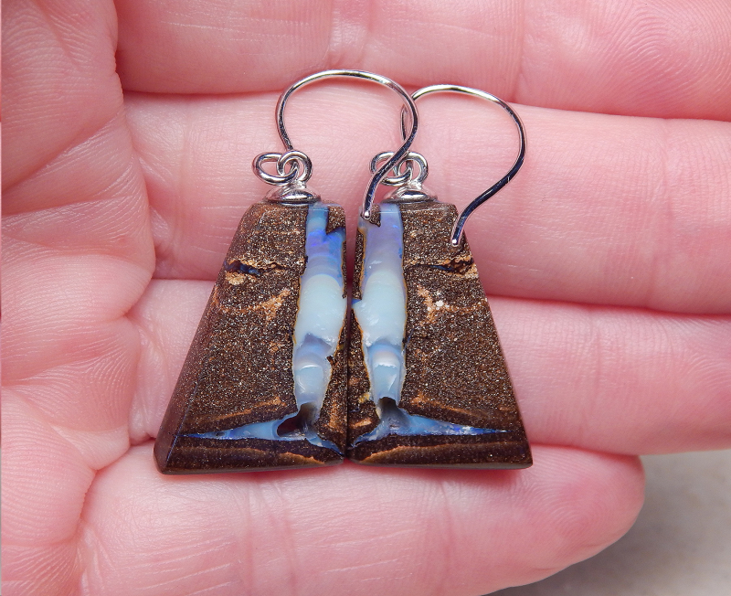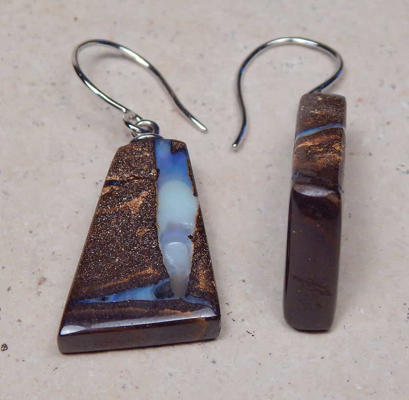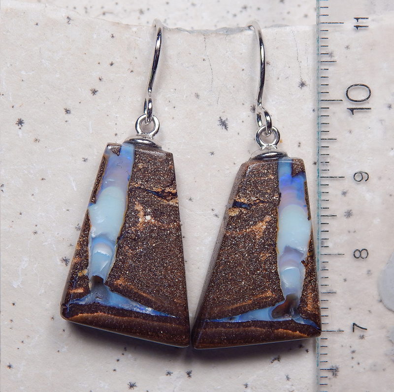925 SS Ohrhänger mit Boulderopal - 925 Sterling Silber rhodiniert - Fundort: Quilpie - Opal: 23 x 17 x 5,6 mm -- Ohrhänger: 41 x 17 mm - Gewicht: 8,62 gr. - Farben: blau & violett - Bitte beachten Sie, dass Unebenheiten, Einschlüsse, Flecken oder Risse, Sprünge o.ä. natürlich sind und keinen Mangel darstellen. Video anklicken